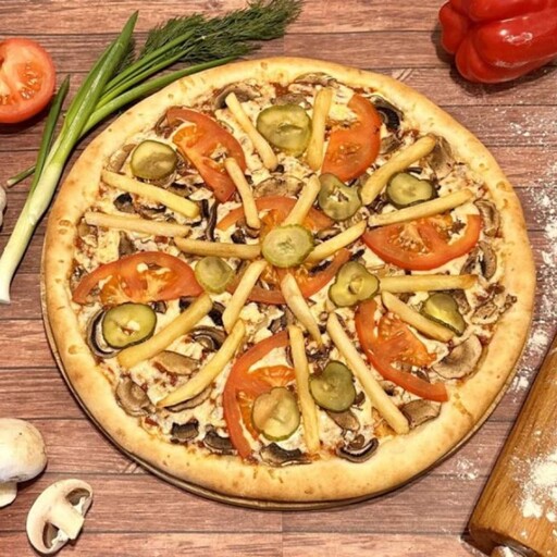 Томатный соус, помидор, шампиньоны, картофель фри, корнишоны, сыр Моцарелла (25 см)