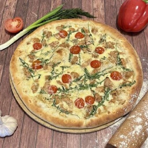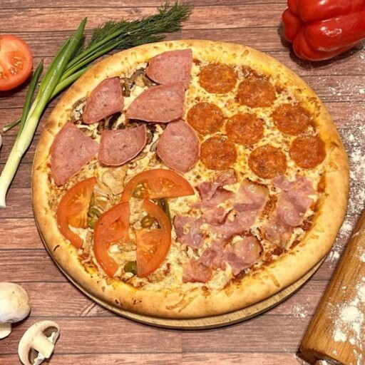 Пицца соус, сыр моцарелла, колбаса пепперони, бекон, перец халапеньо, грудка куриная, помидоры, шампиньоны, ветчина (33 см).
