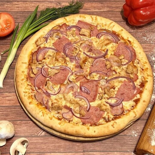 Томатный соус, бекон, курица, ветчина, репчатый лук, сыр Моцарелла (33 см)