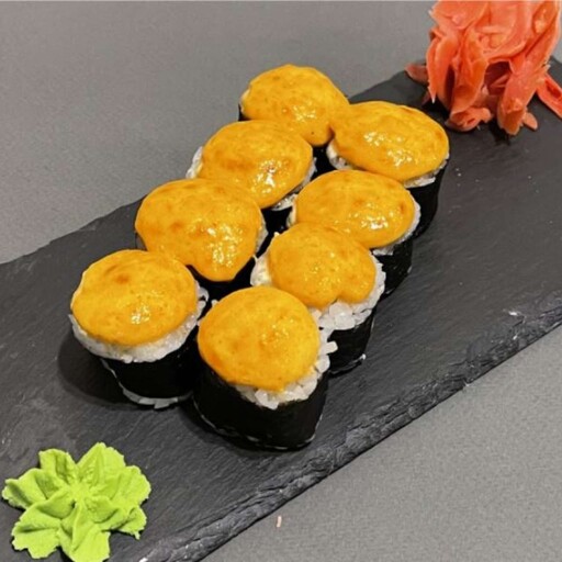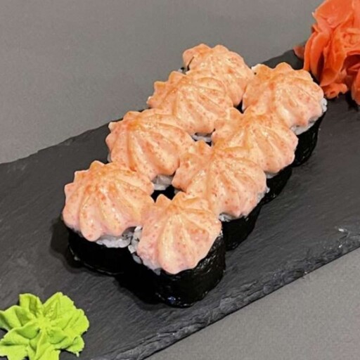 Сливочный сыр, копченый лосось, огурец, икра тобико, соевый лист, сырный гриль-соус, соус унаги, кунжут.