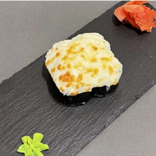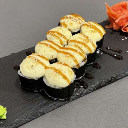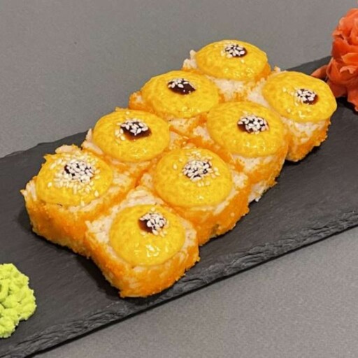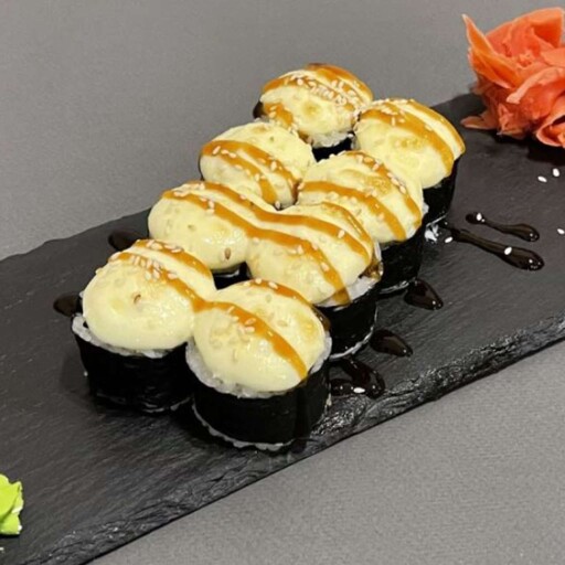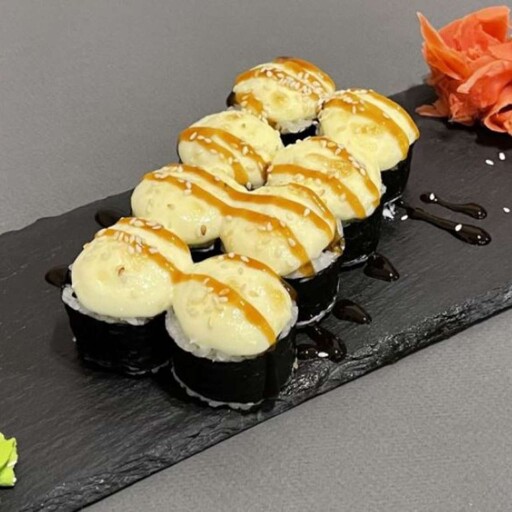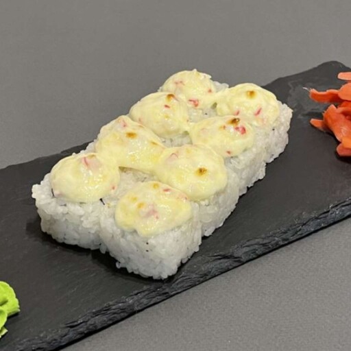 Сырный гриль-соус, снежный краб (имитация), сливочный сыр, огурец, соус унаги, кунжут.